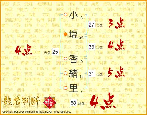 小(3画)塩(24画) 香(9画)緒(15画)里(7画)