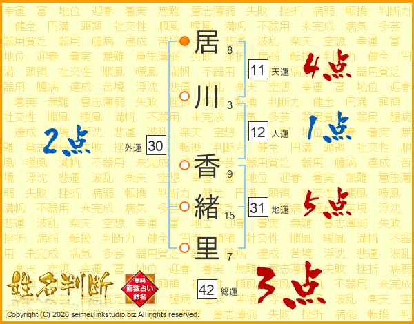 居(8画)川(3画) 香(9画)緒(15画)里(7画)