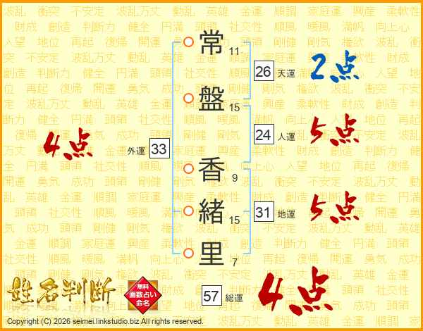 常(11画)盤(15画) 香(9画)緒(15画)里(7画)