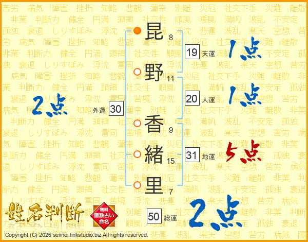 昆(8画)野(11画) 香(9画)緒(15画)里(7画)