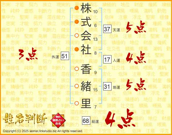 株(10画)式(6画)会(13画)社(8画) 香(9画)緒(15画)里(7画)