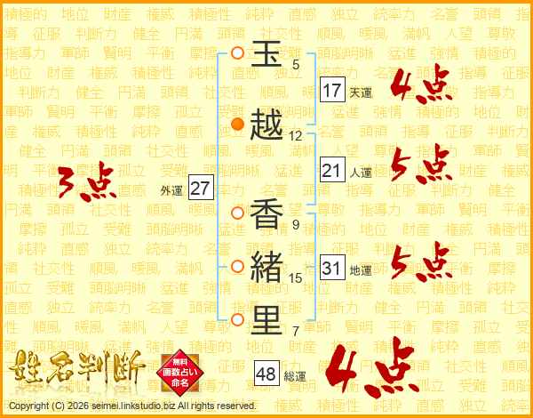 玉(5画)越(12画) 香(9画)緒(15画)里(7画)