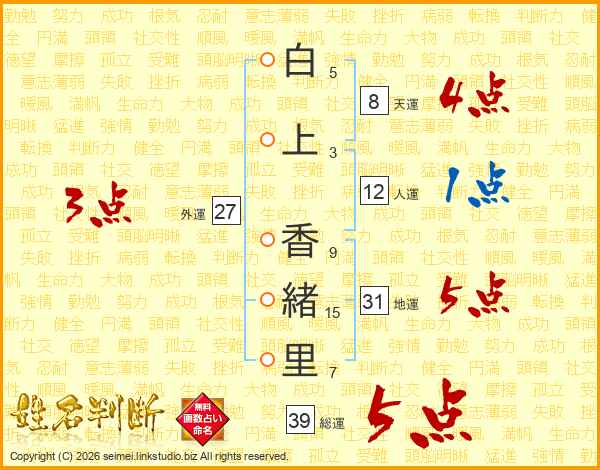 白(5画)上(3画) 香(9画)緒(15画)里(7画)