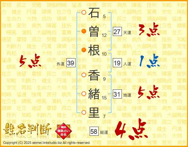 石(5画)曽(12画)根(10画) 香(9画)緒(15画)里(7画)
