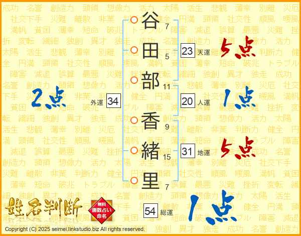 谷(7画)田(5画)部(11画) 香(9画)緒(15画)里(7画)