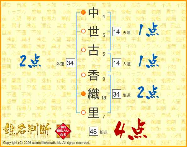 中(4画)世(5画)古(5画) 香(9画)織(18画)里(7画)