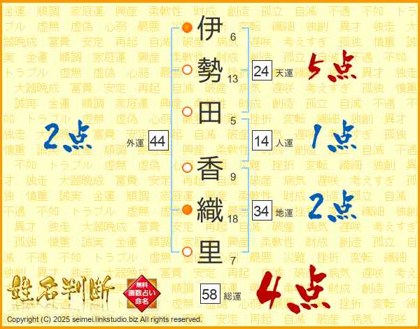 伊(6画)勢(13画)田(5画) 香(9画)織(18画)里(7画)