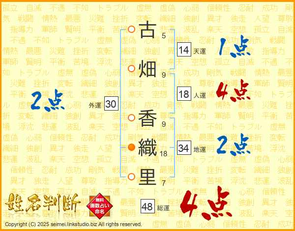 古(5画)畑(9画) 香(9画)織(18画)里(7画)