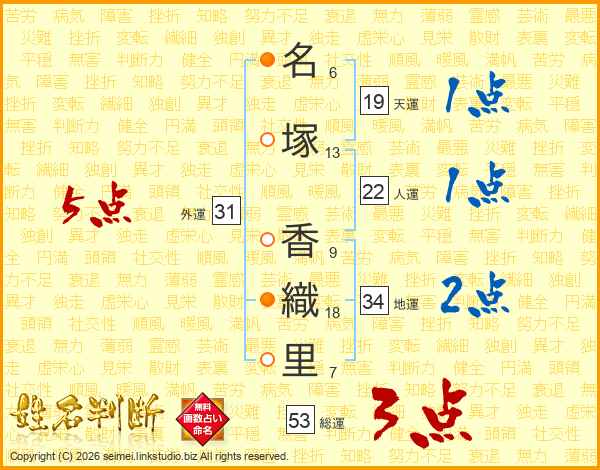 名(6画)塚(13画) 香(9画)織(18画)里(7画)