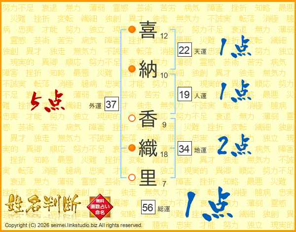 喜(12画)納(10画) 香(9画)織(18画)里(7画)