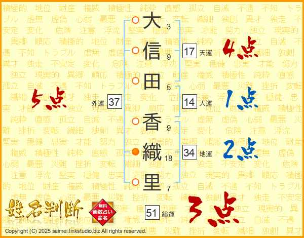 大(3画)信(9画)田(5画) 香(9画)織(18画)里(7画)