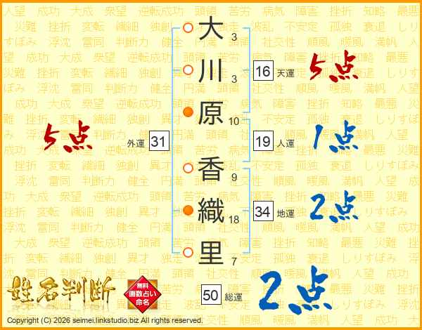 大(3画)川(3画)原(10画) 香(9画)織(18画)里(7画)