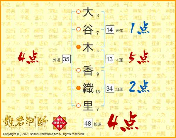 大(3画)谷(7画)木(4画) 香(9画)織(18画)里(7画)