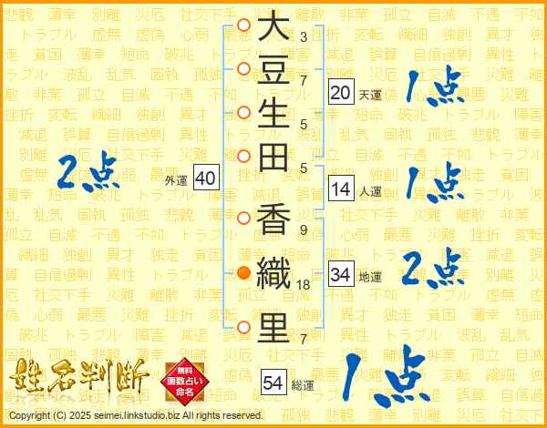 大(3画)豆(7画)生(5画)田(5画) 香(9画)織(18画)里(7画)