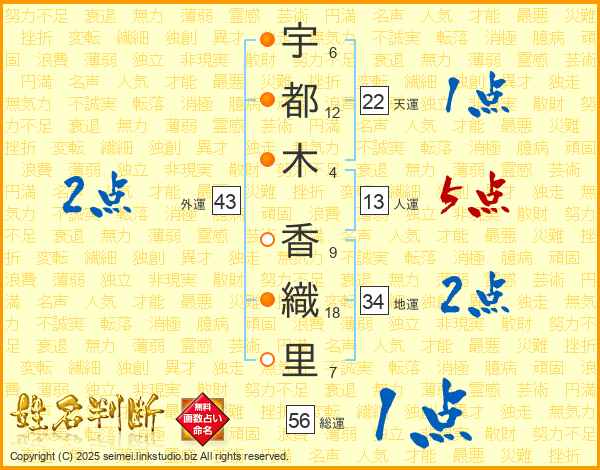 宇(6画)都(12画)木(4画) 香(9画)織(18画)里(7画)