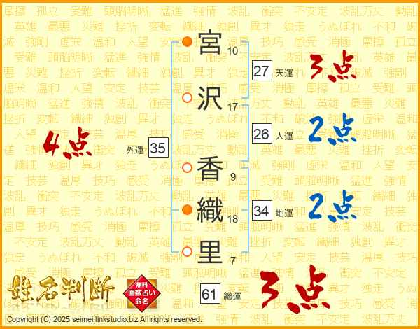 宮沢香織里さんの総運は61画の3点!