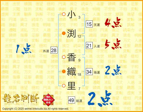 小(3画)渕(12画) 香(9画)織(18画)里(7画)