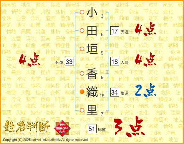 小(3画)田(5画)垣(9画) 香(9画)織(18画)里(7画)