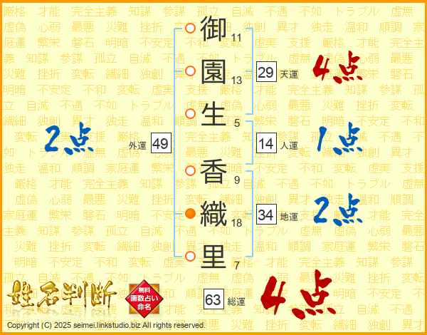 御(11画)園(13画)生(5画) 香(9画)織(18画)里(7画)