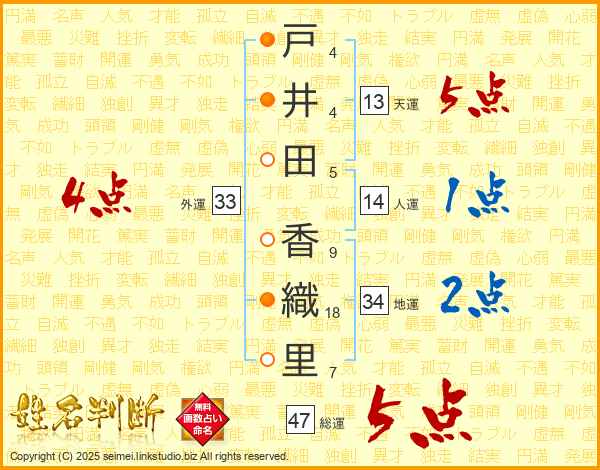 戸(4画)井(4画)田(5画) 香(9画)織(18画)里(7画)