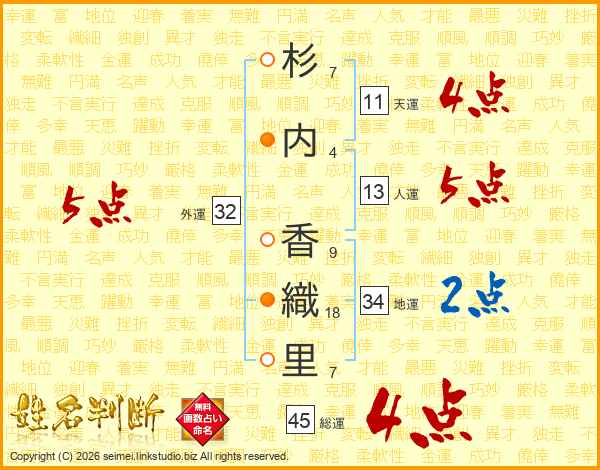 杉(7画)内(4画) 香(9画)織(18画)里(7画)