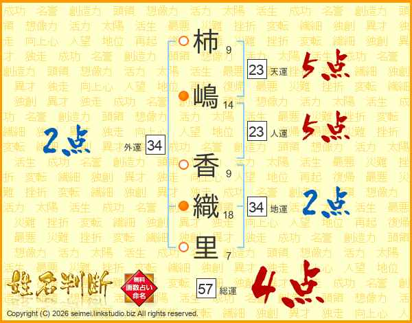 柿(9画)嶋(14画) 香(9画)織(18画)里(7画)