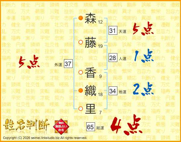 森(12画)藤(19画) 香(9画)織(18画)里(7画)