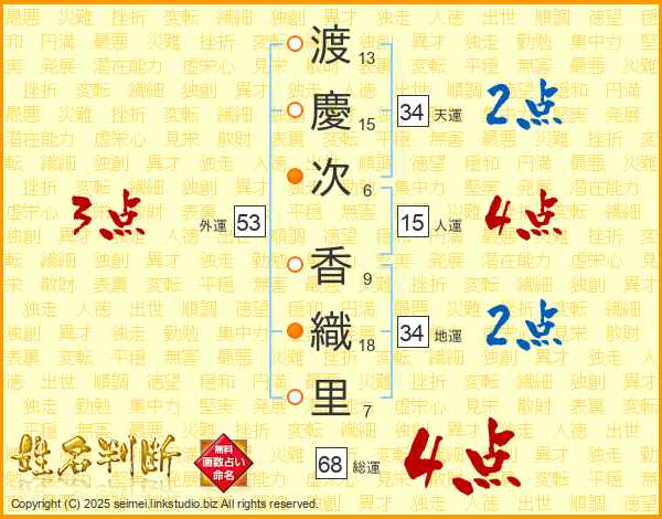 渡(13画)慶(15画)次(6画) 香(9画)織(18画)里(7画)