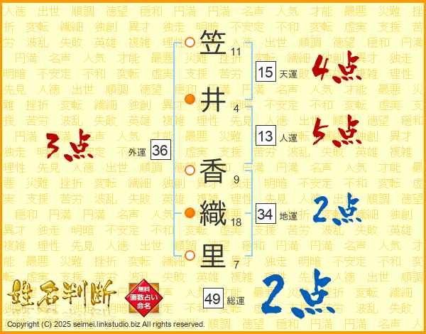 笠(11画)井(4画) 香(9画)織(18画)里(7画)