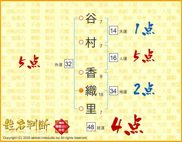 谷(7画)村(7画) 香(9画)織(18画)里(7画)