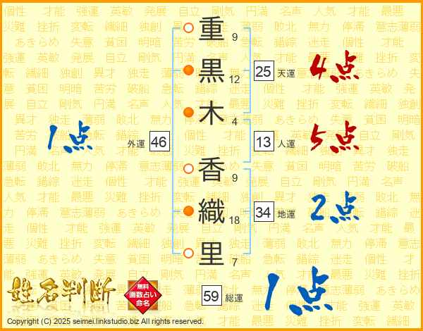重(9画)黒(12画)木(4画) 香(9画)織(18画)里(7画)