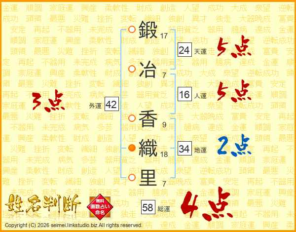 鍛(17画)冶(7画) 香(9画)織(18画)里(7画)