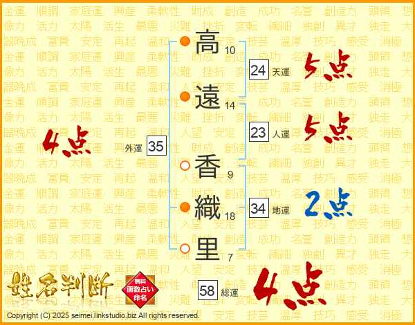 高(10画)遠(14画) 香(9画)織(18画)里(7画)