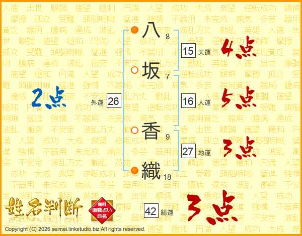 八(8画)坂(7画) 香(9画)織(18画)