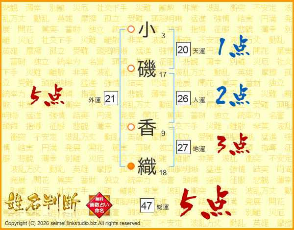 小(3画)磯(17画) 香(9画)織(18画)