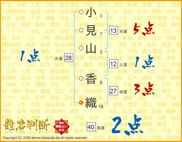 小(3画)見(7画)山(3画) 香(9画)織(18画)