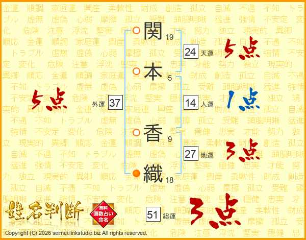 関(19画)本(5画) 香(9画)織(18画)