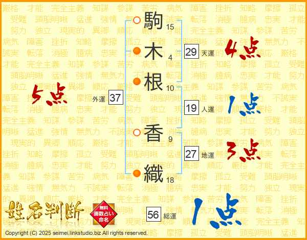 駒(15画)木(4画)根(10画) 香(9画)織(18画)