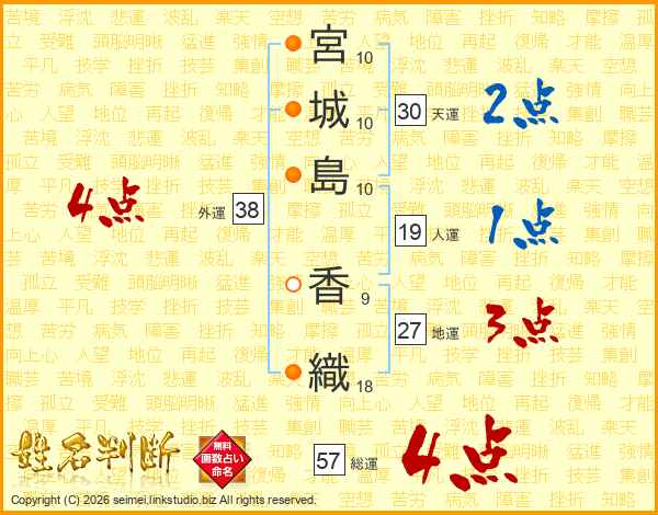 宮(10画)城(10画)島(10画) 香(9画)織(18画)