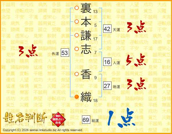 裏(13画)本(5画)謙(17画)志(7画) 香(9画)織(18画)