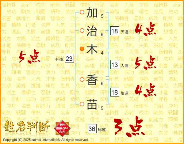 加(5画)治(9画)木(4画) 香(9画)苗(9画)