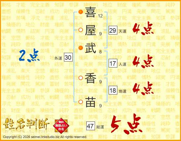 喜(12画)屋(9画)武(8画) 香(9画)苗(9画)
