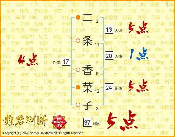 生活面を象徴する運勢です。外部から受ける影響力を表し、結婚運、家庭運や職場、環境への順応性を表します。総運から人運を引いた画数。姓や名が1文字の場合を除く。