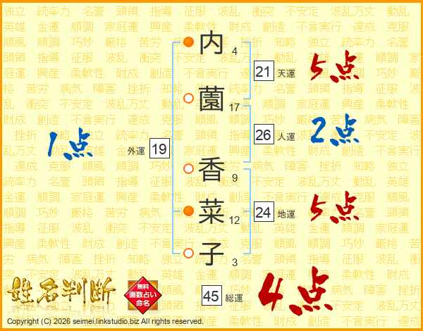 内(4画)薗(17画) 香(9画)菜(12画)子(3画)