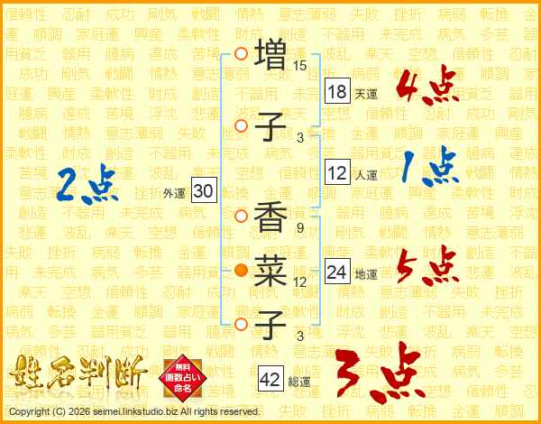 増(15画)子(3画) 香(9画)菜(12画)子(3画)
