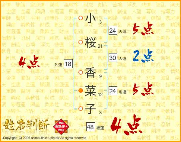 小(3画)桜(21画) 香(9画)菜(12画)子(3画)