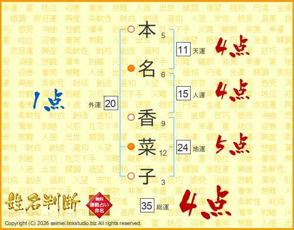 本名香菜子さんの総運は35画の4点!