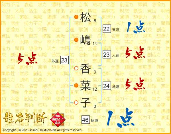 松(8画)嶋(14画) 香(9画)菜(12画)子(3画)