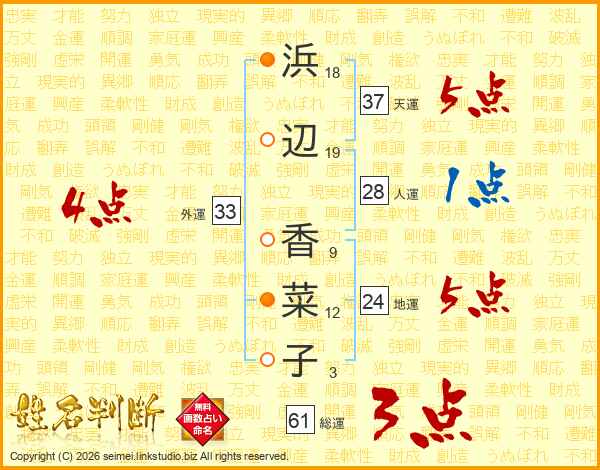 浜(18画)辺(19画) 香(9画)菜(12画)子(3画)