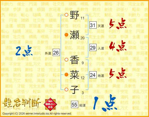 野(11画)瀬(20画) 香(9画)菜(12画)子(3画)